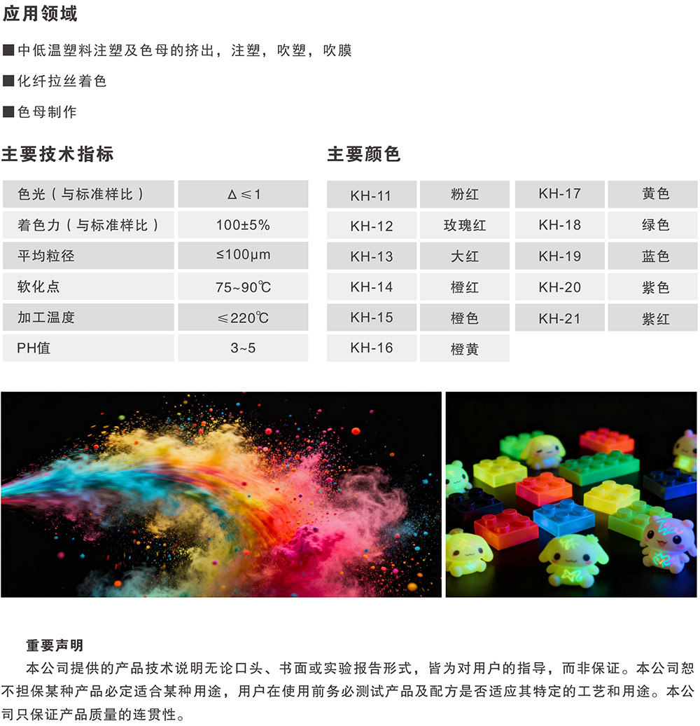 产品特点 KH系列荧光颜料具有强烈的荧光效果及易混合性能和较好的不粘螺杆性,色彩鲜艳,荧光度强,分散性能良好,在135℃-220℃温度范围内达到极佳分散效果且无甲醛气体排放。特别推荐用于中低温段塑料等领域的着色,可用于挤出、吹塑、吹膜等工艺。