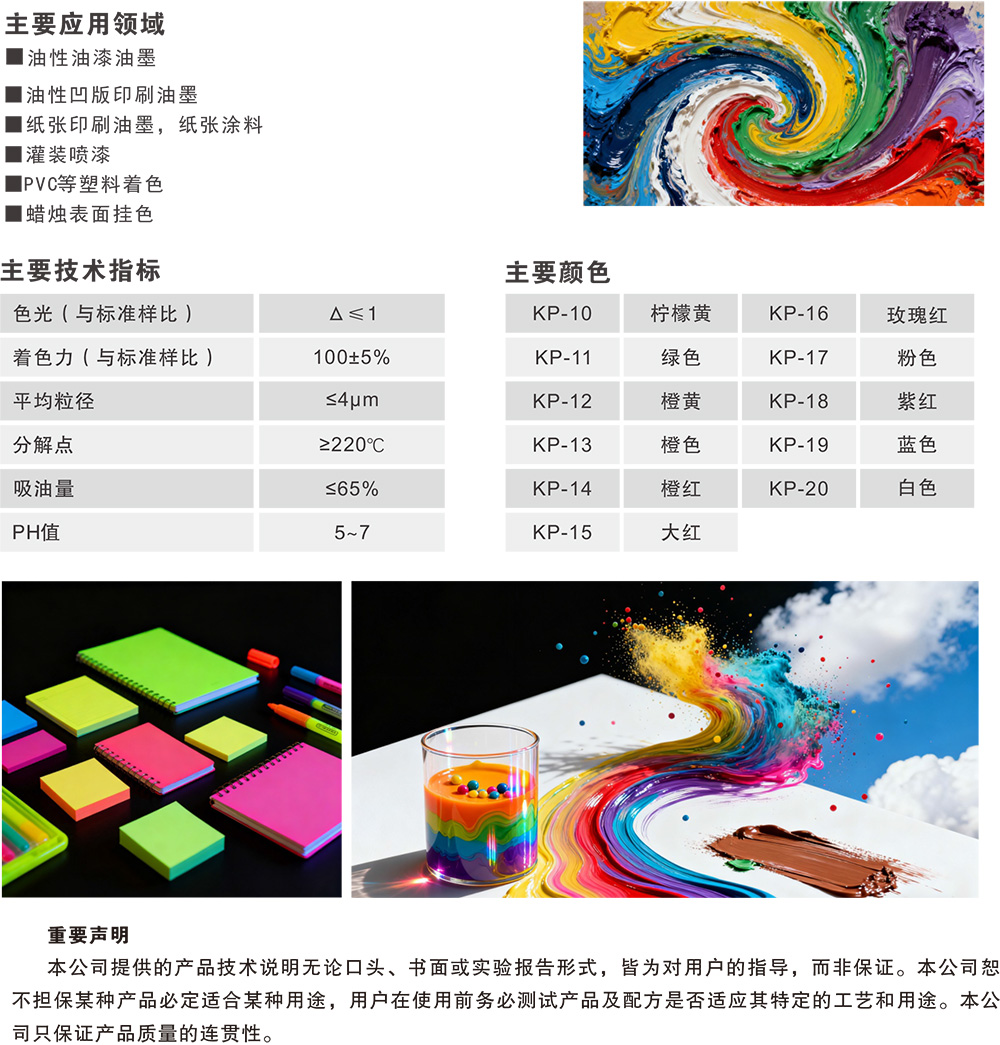 产品特点 KP系列荧光颜料是以热固型树脂为基础的颜料,它具有较高的荧光度鲜艳度和着色力以及较强的抗溶剂性,尤其可耐常用的酮类,酯类以及醇类等,适用于油墨、涂料、喷漆、PVC 有机溶胶、水性乳胶漆及天然橡胶等产品。