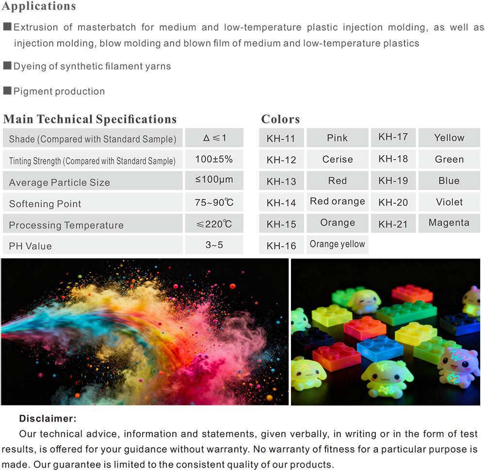 The KH series of fluorescent pigments feature intense fluorescence, easy blending properties, and good non-sticking screw performance. They are vivid in color, highly fluorescent, and have excellent dispersion. With vivid color and strong fluorescence, they offer excellent dispersibility, which ensures optimal dispersion within the temperature range of 135°C to 220°C and is free from formaldehyde emissions. They are particularly recommended for coloring in the medium and low-temperature segments of plastics and other fields, and can be used in processes such as extrusion, blow molding, and blown film.