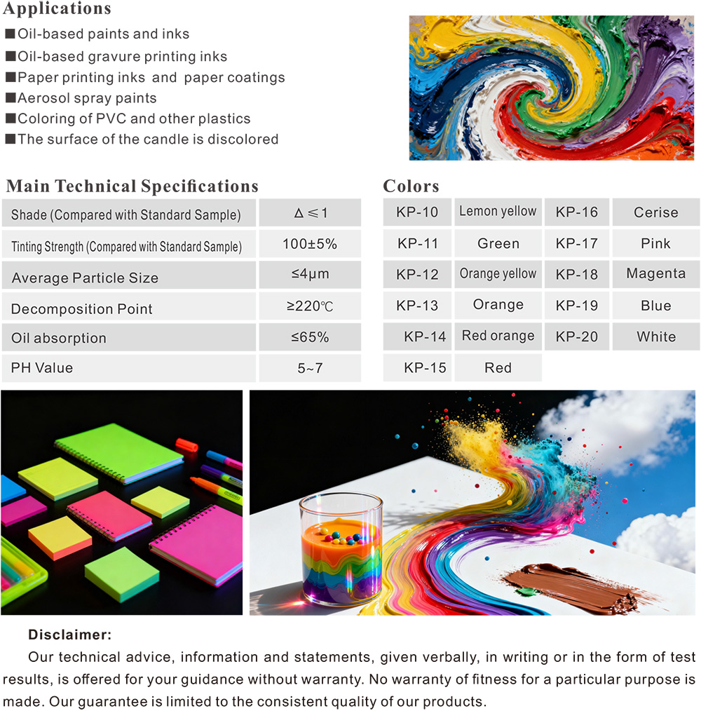 The KP series fluorescent pigments are based on thermosetting resins. They possess high fluorescence intensity, vivid coloration ability and strong solvent resistance. Particularly, they can withstand common ketones, esters and alcohols, etc. They are suitable for products such as inks, coatings, spray paints, PVC organic solvents, water-based latex paints and natural rubber.