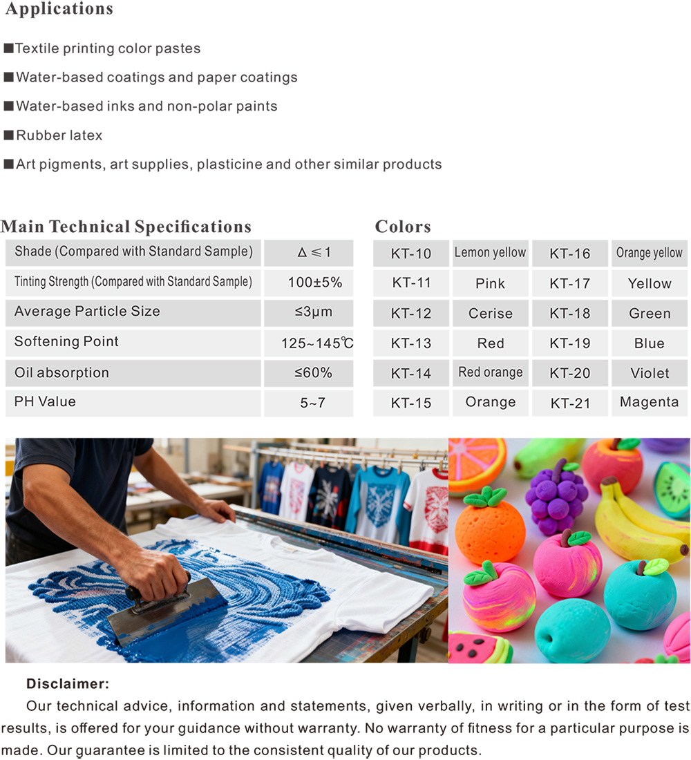 The KT series fluorescent pigments feature bright colors, strong fluorescence, good dispersion performance, and fine particle size. They have stable quality and a wide variety, and are suitable for use in textile printing color pastes, paper coatings, rubber latex and other products.