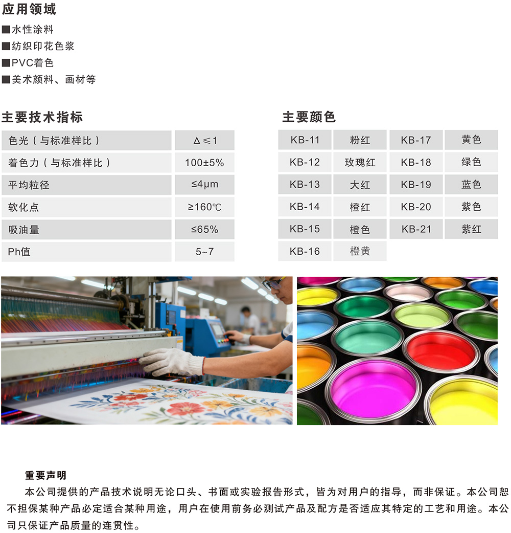 产品特点 KB系列荧光颜料具有荧光度强、分散性能好、不含甲醛、粒径细微等特点,适用于纺织品印花色浆、 PVC 着色等。