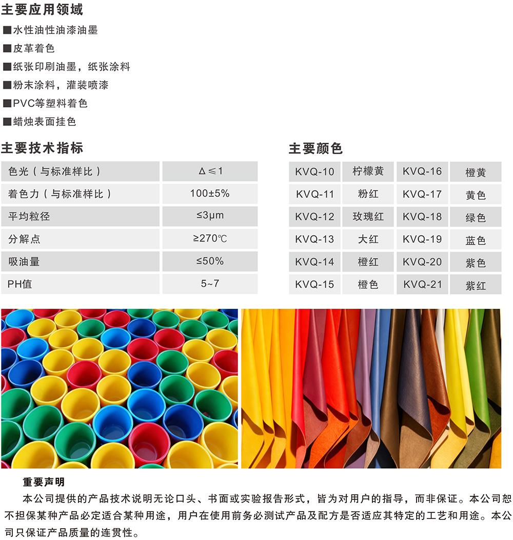 产品特点 KVQ系列是微球型荧光颜料,属于热固性荧光树脂颜料,具有色彩鲜艳,荧光度强、分散性能好、耐迁移和耐溶剂强等特点。