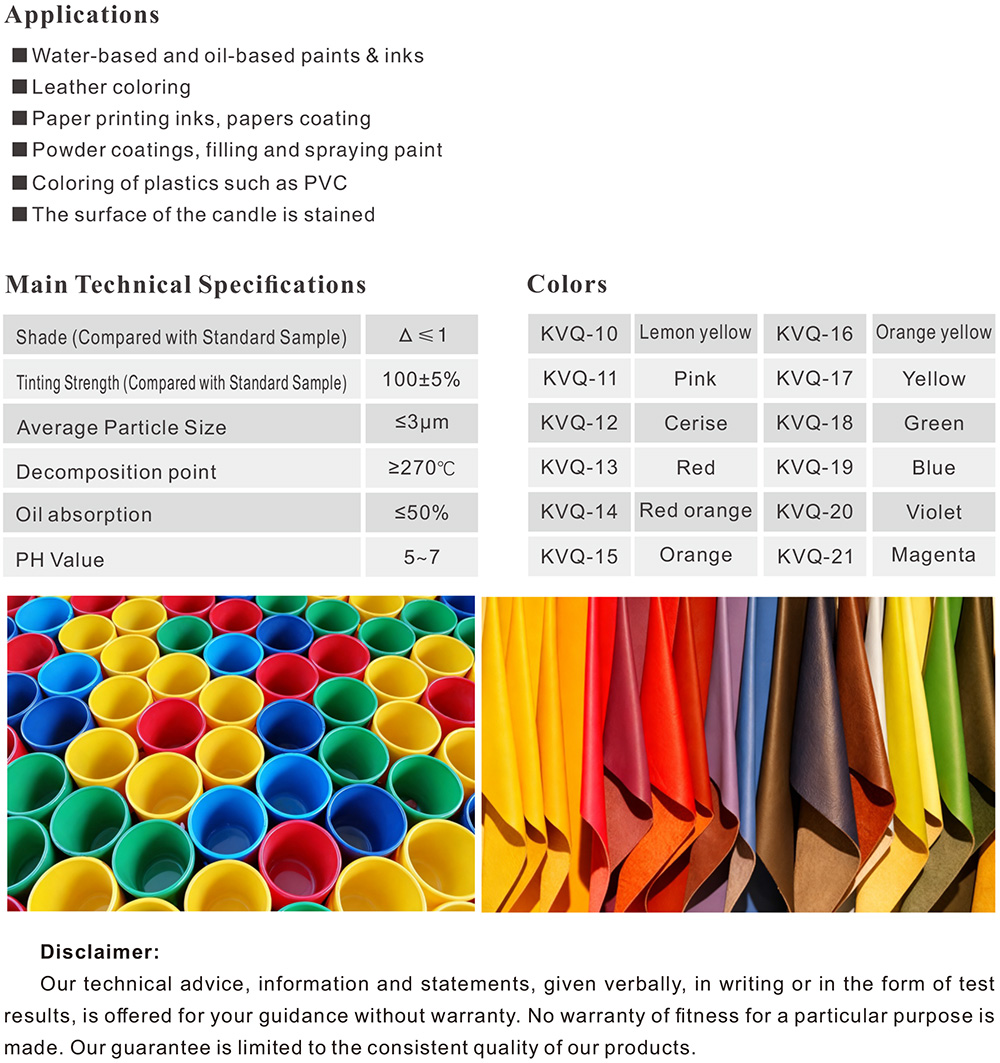 The KVQ series is a type of microsphere fluorescent pigment, belonging to thermosetting fluorescent resin pigment. It features bright colors, strong fluorescence, excellent dispersion performance, and strong resistance to migration and solvents.