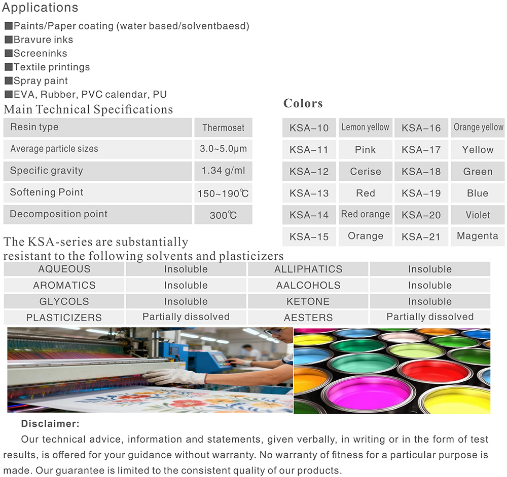 KSA-type is the thermoset fluorescent pigments which is an environmentally-friendly product offormaldehyde free. It is offering bringtness and color strength for printing ink,paint and paper coatingssystem, either water or solvent based.KSA pigments show good dispersion which is compatible with most polymers in plastic use, superiortemperature resistance and light stability designed for use in widely application.